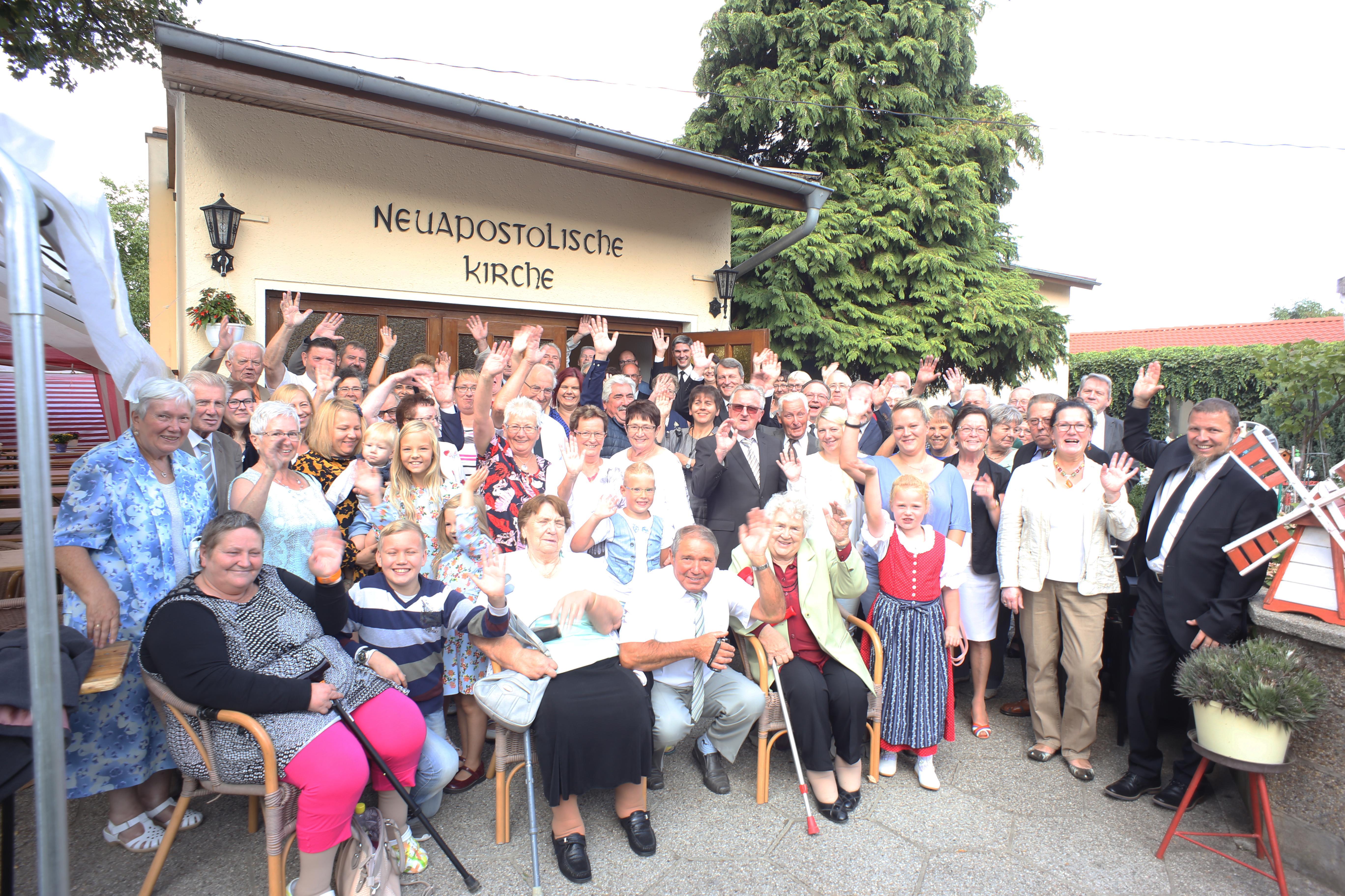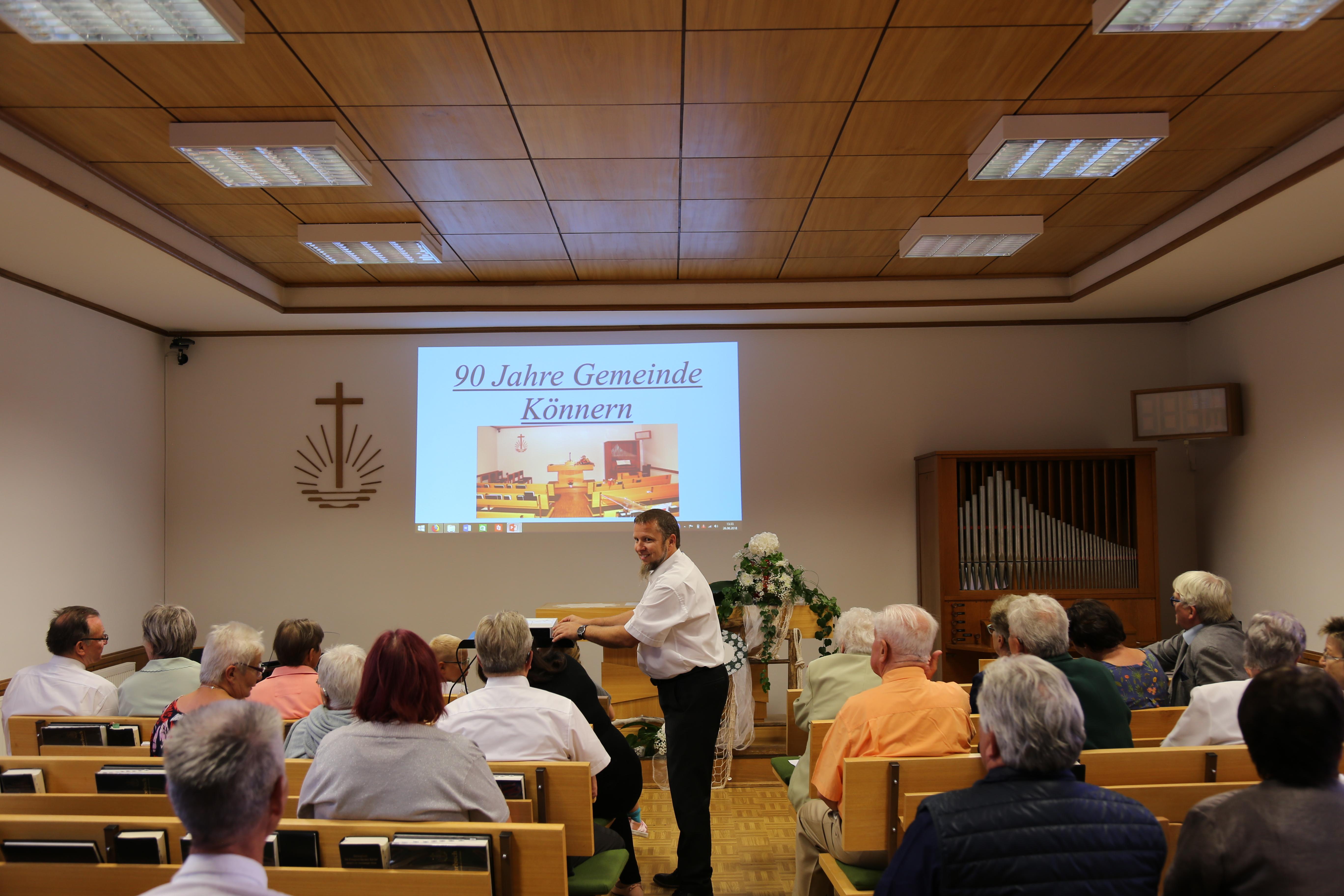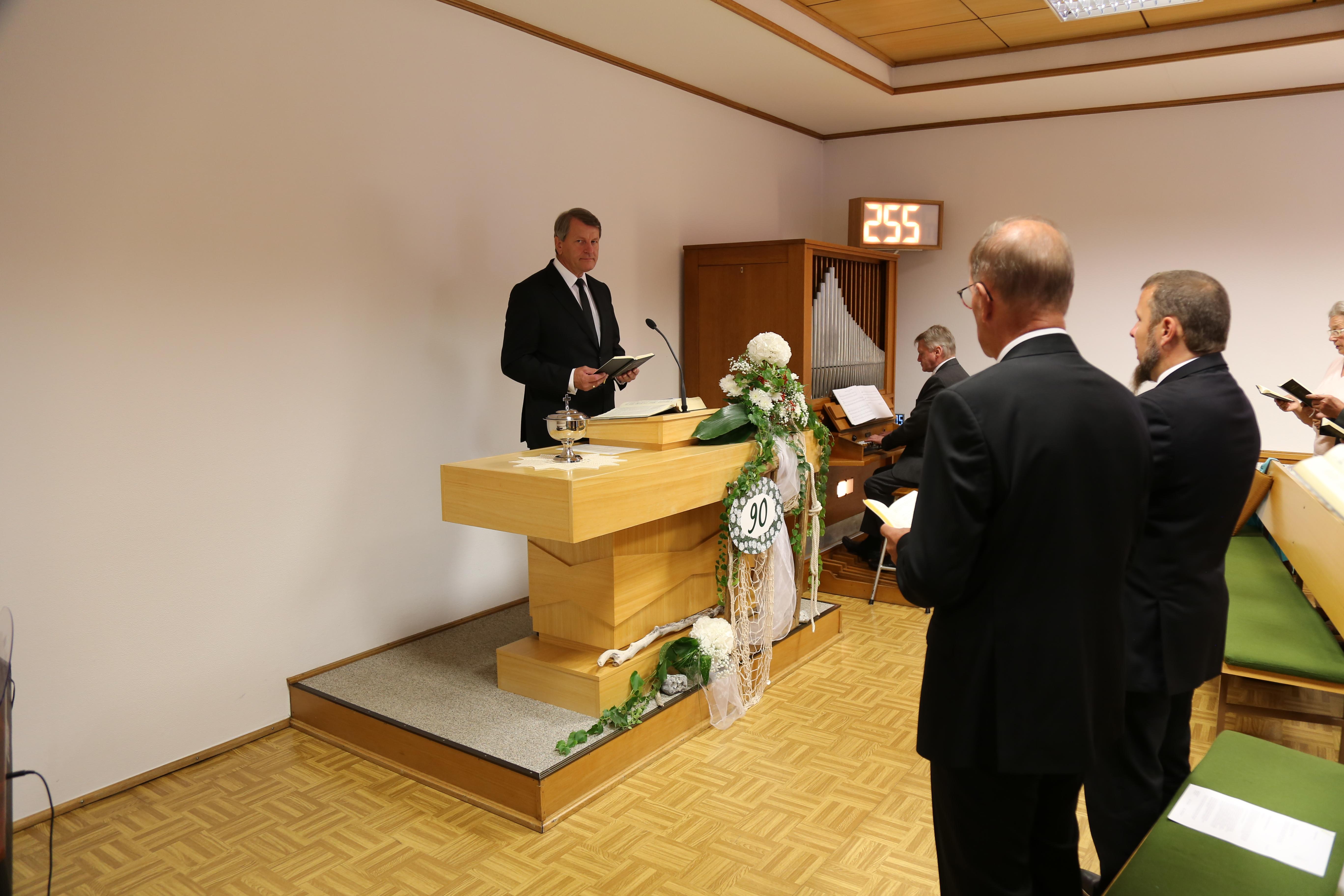 Der Festtag begann vormittags mit einem Festgottesdienst den der Bezirksälteste Klaus Koselack hielt. Dazu kamen zahlreiche Geschwister aus Nah und Fern, sowie Freunde und Bekannte. Mit etwa 70 Personen wurde es im Gotteshaus etwas eng. Doch alle rückten zusammen und erlebten in einem „Wir-Gefühl“ einen freudigen und segensreichen Gottesdienst.
